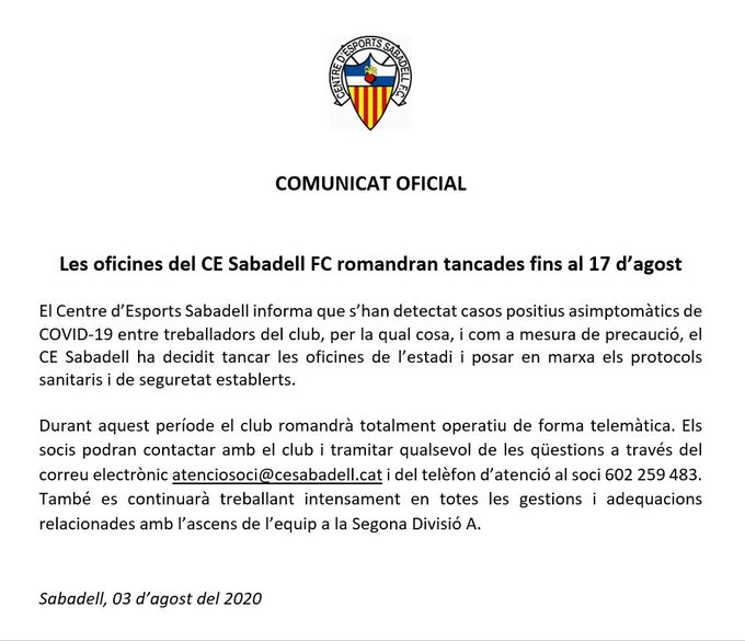 El 3 de agosto de 2020, el CE Sabadell emitia un comunicado y se informaba a los socios y aficionados que se habian detectado varios positivos por coronavirus entre los trabajadores del club por lo que decidía cerrar las oficinas de la Nova Creu Alta hasta el 17 de agosto. El club vallesano informaba que se trataba de casos asintomáticos en su totalidad pero que activa los protocolos sanitarios y de seguridad para evitar que hubiera más contagios